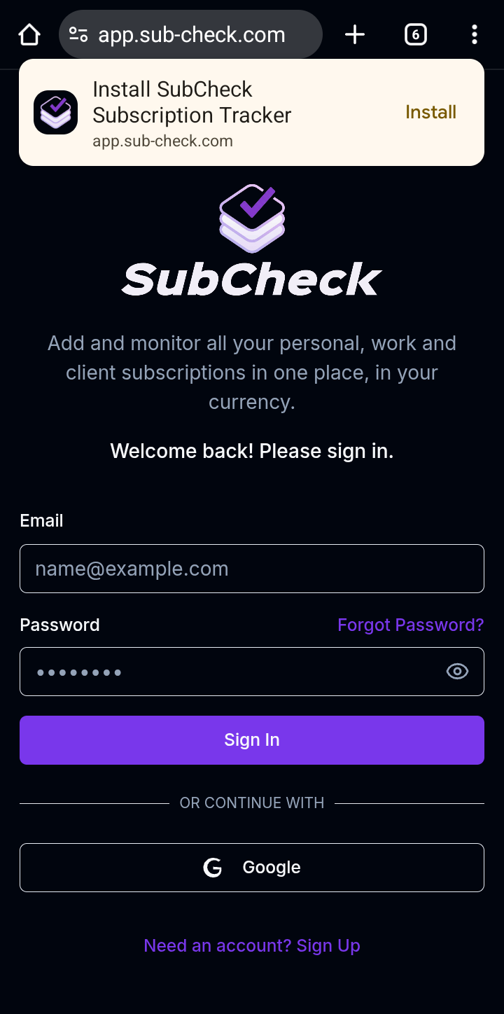 Select your browser menu to "Install SubCheck" as PWA. No App Store or Play Store download required!